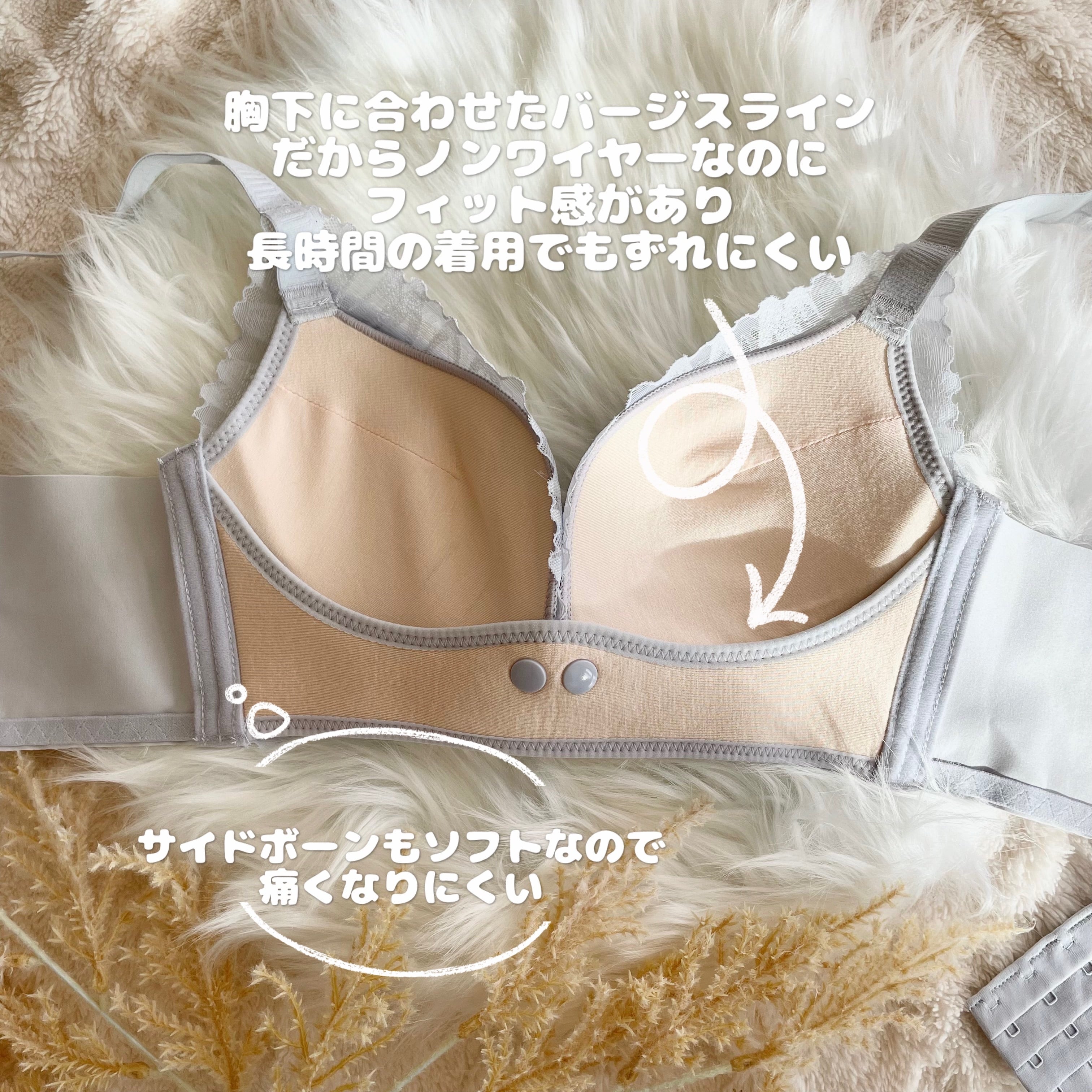 ・他社製品はワイヤーがあたって痛かったり、ノンワイヤーでも胸が流れがちですが、しっかり持ち上げてくれてる感じです。とても肌触りが柔らかくて着け心地もいいです(ファッションブラとしてご着用)